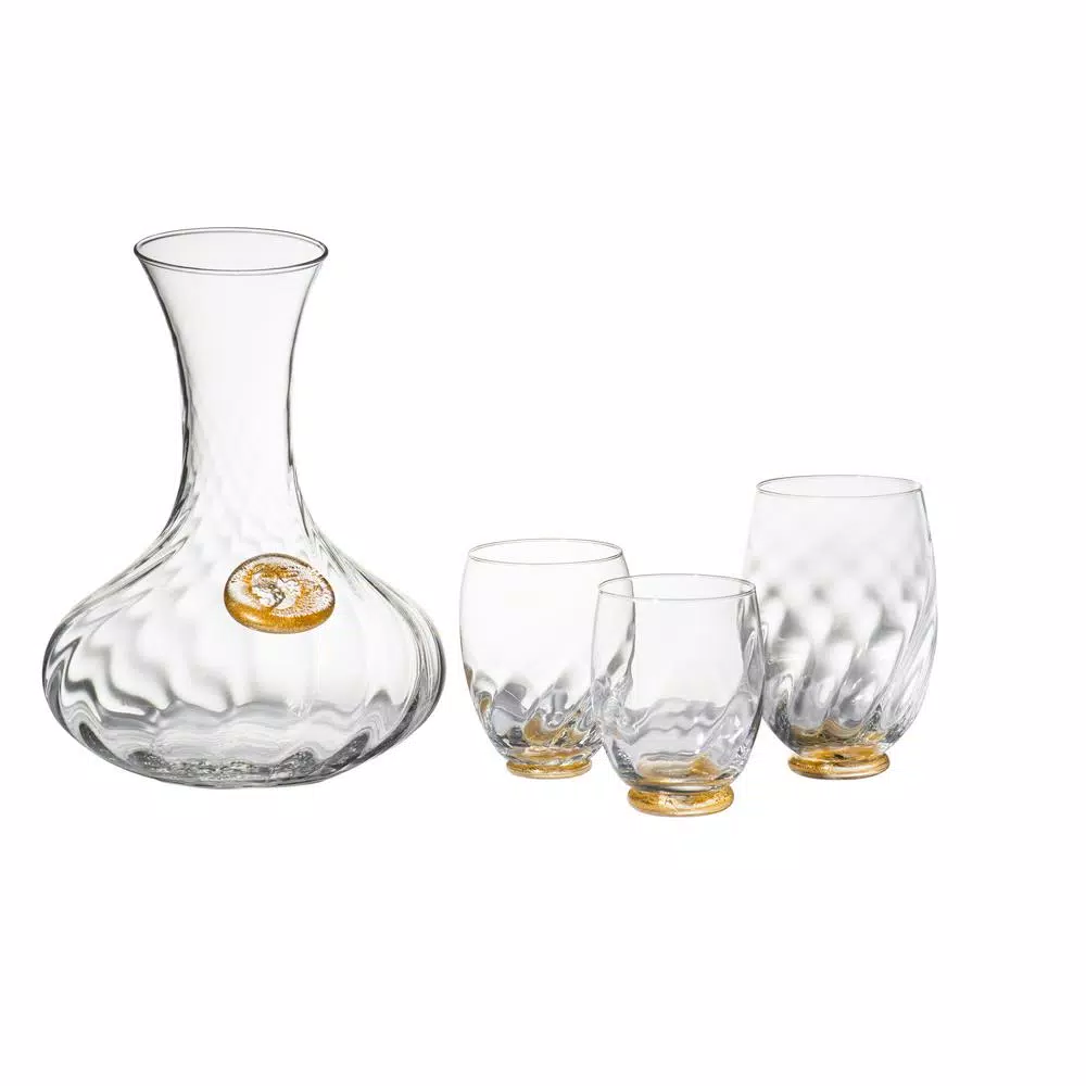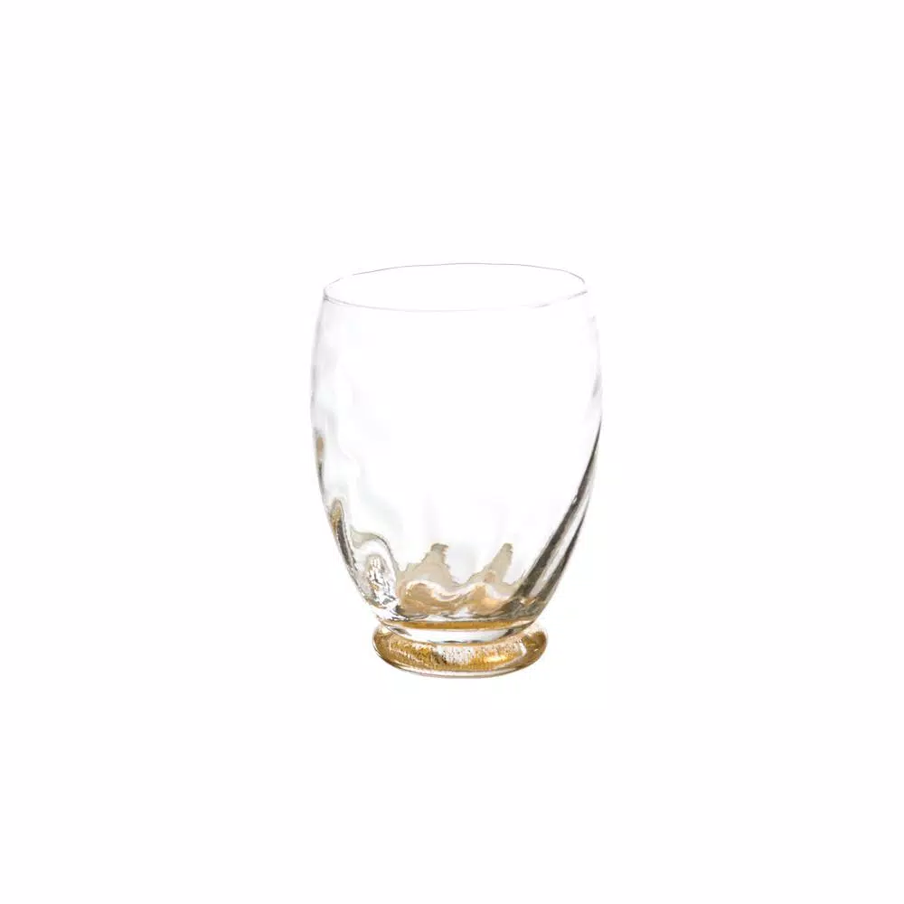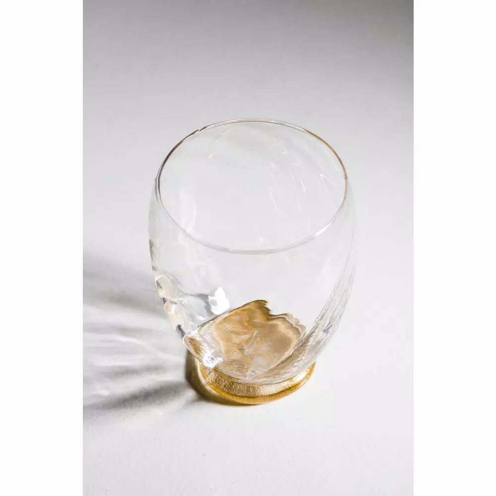 This is a beautiful Italian made stemless glass with gold infused into the base. It makes a very elegant setting on any table. It comes in a set of 4.