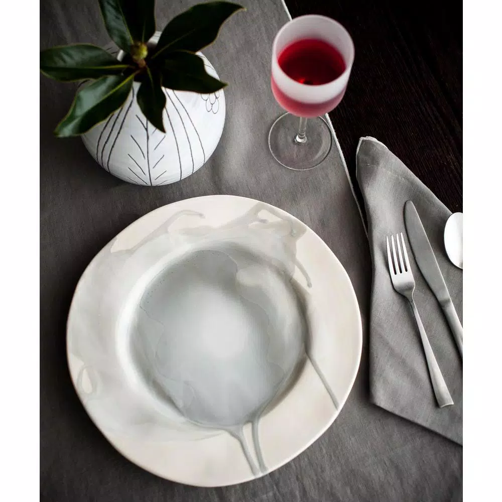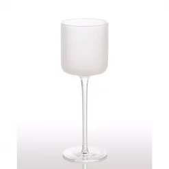 This is a sophisticated collection of table top glassware that includes a champagne, wine, and water glasses. A carafe and pitcher finish out this group of contemporary glassware of frosted and clear pieces. It is recommended to handwash these glasses.