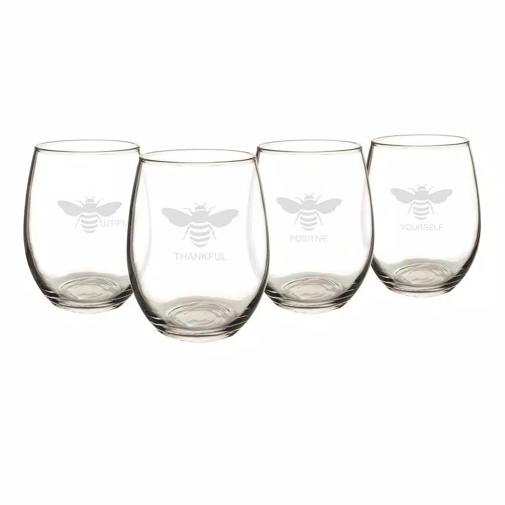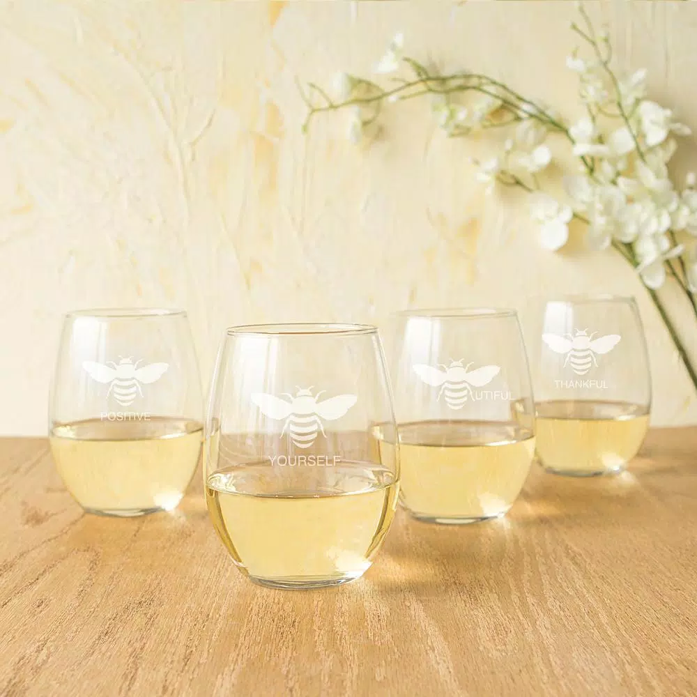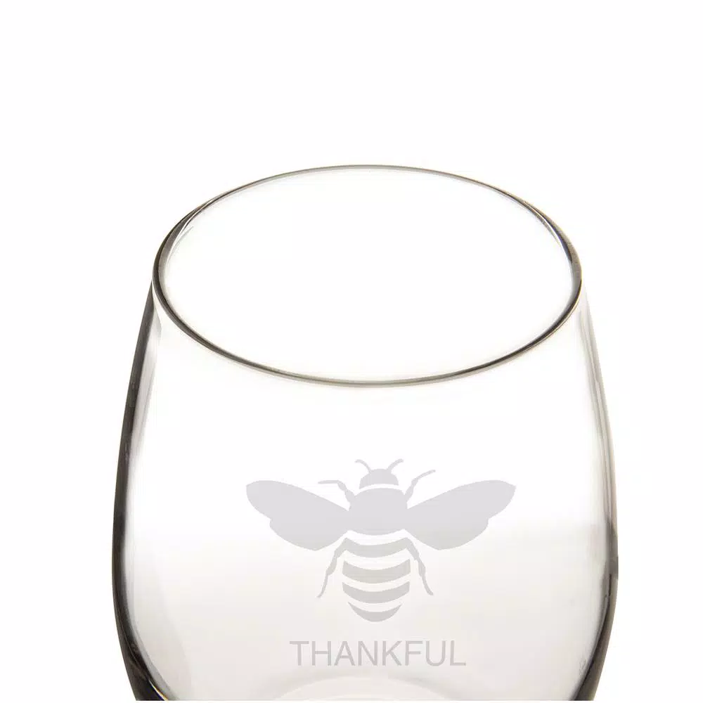 The Bee Thankful Stemless Wine Glasses are perfect for everyday dining and special occasions. Engraved with a cheerful “bee” design and phrase, each glass is beautifully crafted with a flat bottom and modern belle. This wine set would be a great gift for any wine/bee enthusiast or an excellent addition to your own glassware collection.