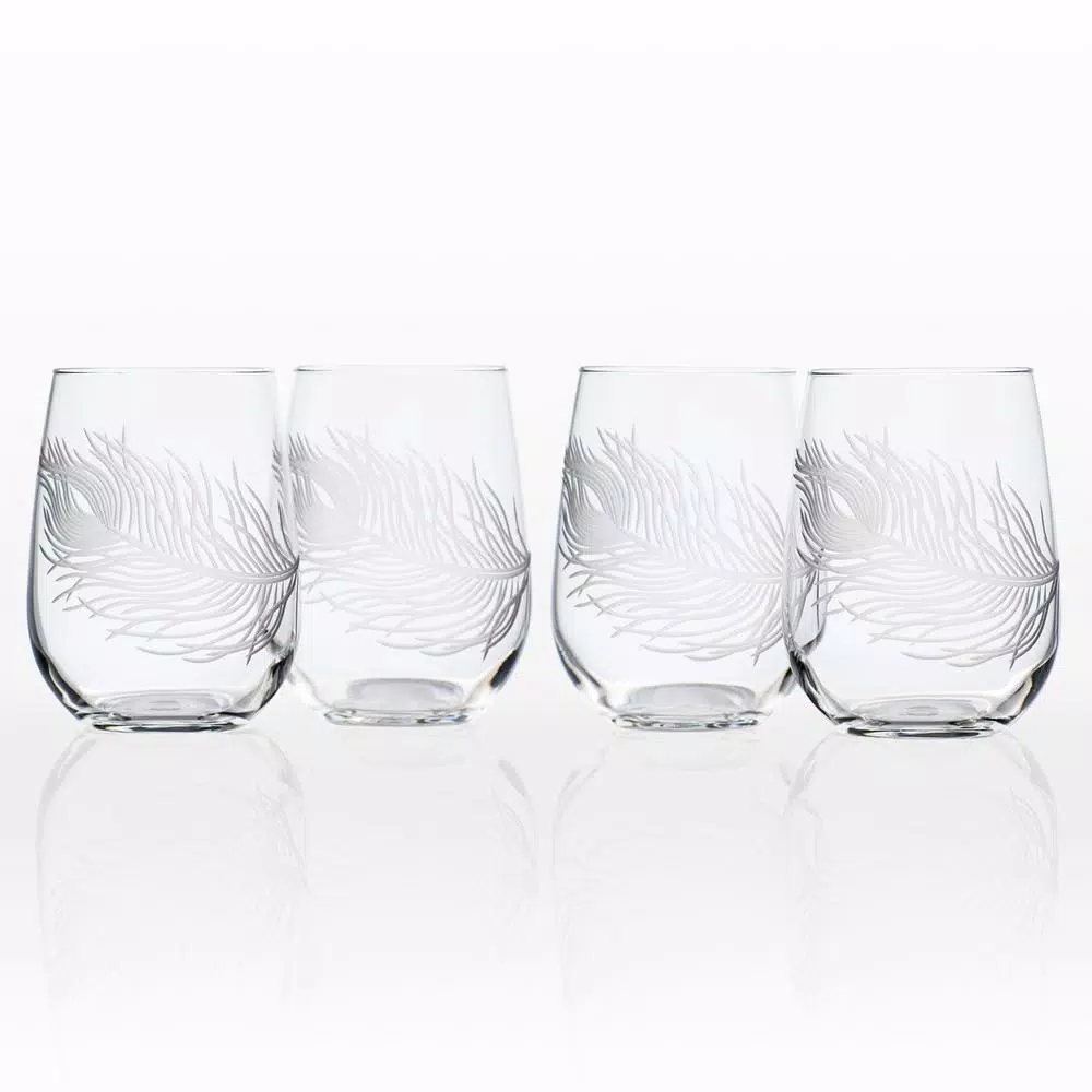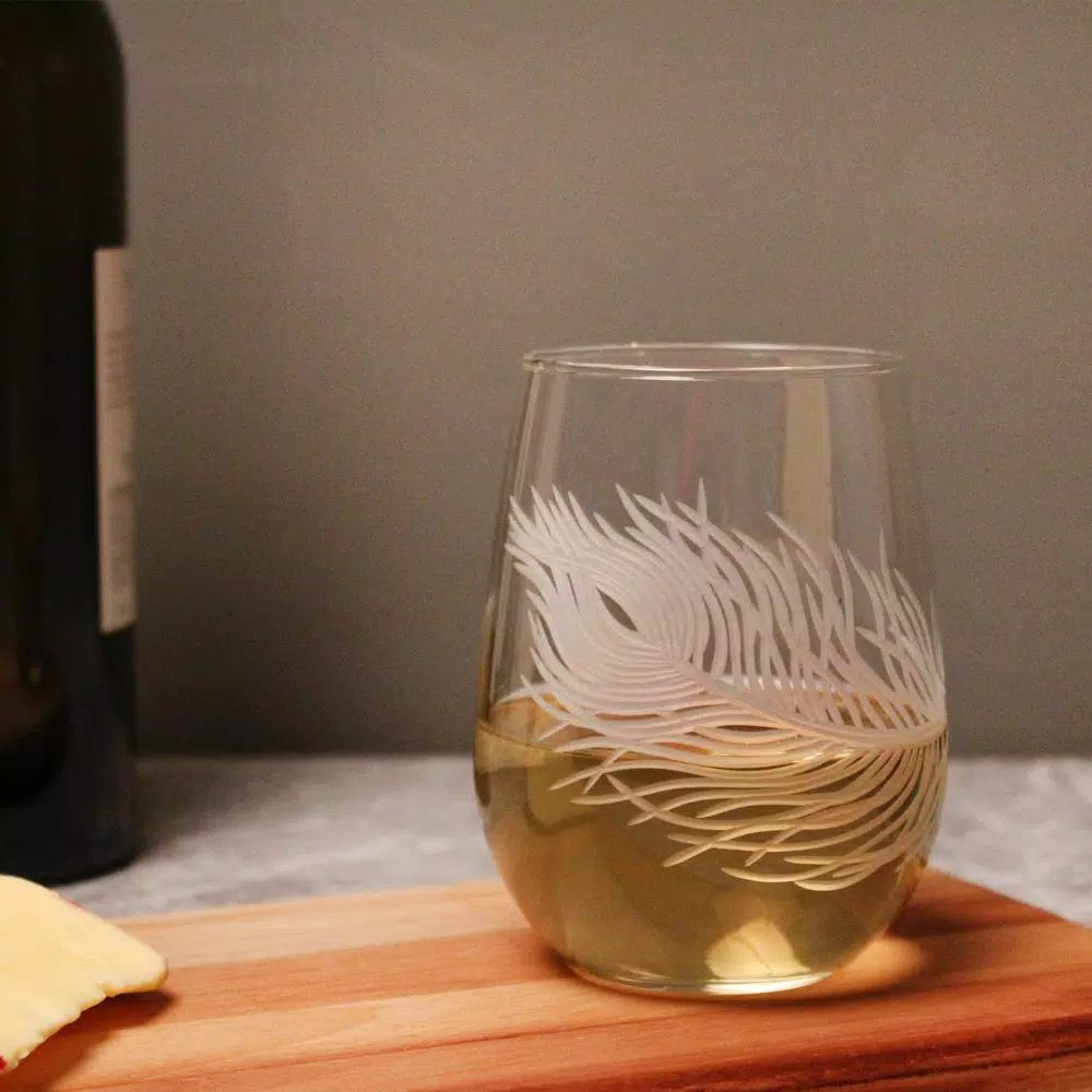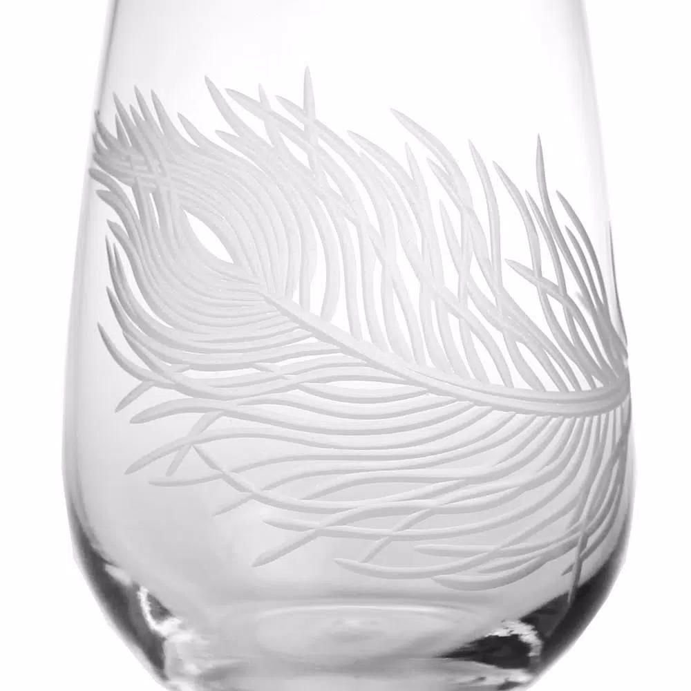 The delicate beauty of the peacock feather, playfully adorns this lovely stemless wine. Symbolic of immortality, protection, enlightenment and renewal, these designs evoke an airy summers afternoon. Create a majestic moment of your own with these delightful additions to your tabletop decor.