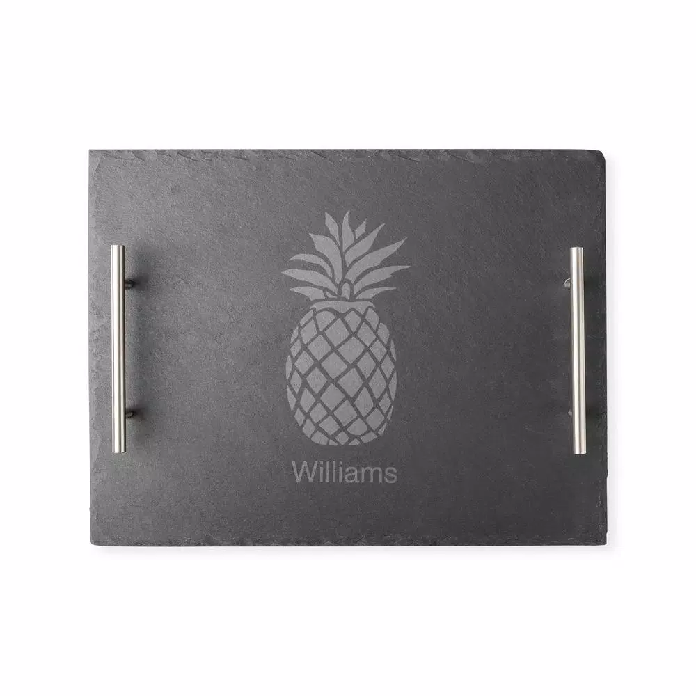 The Personalized Pineapple Slate Serving Board makes for a beautiful display of welcome in your home. Cut from slate with a natural edge, this distinctive serving tray features two stainless steel handles. It also has EVA feet to prevent sliding on any surface.
