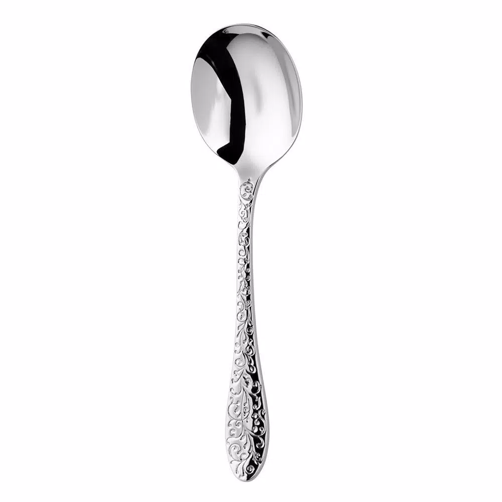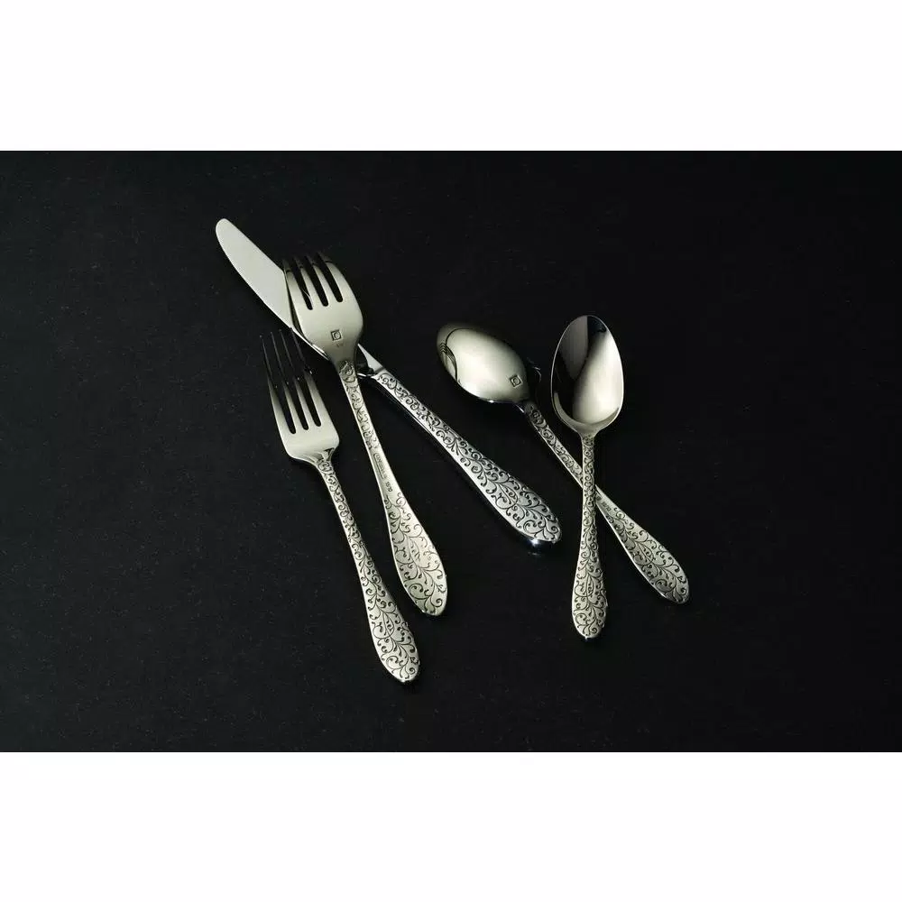 Decorative, paisley inspired flatware that features a high polished finish. Detailed with scrollwork enhanced with oxidized incised lines to elevate the beauty of each handle. Dishwasher safe.