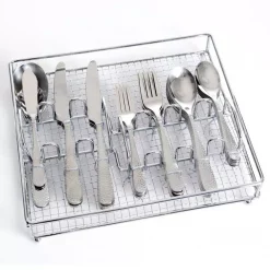 - Set includes: 8-dinner knife, 8-dinner fork, 8-dinner spoon, 8-teaspoon and 8-salad fork, 1-serving spoon, 1-slotted serving spoon, 1-butter knife and 1-sugar shell plus a wire caddy